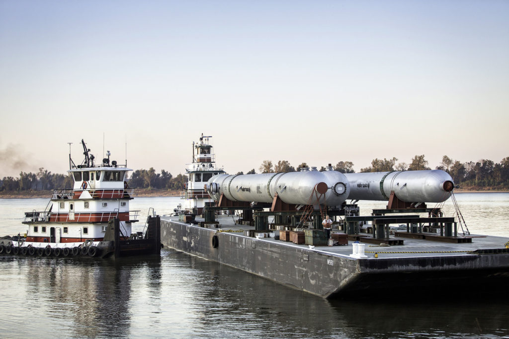 Over 600 pieces of equipment are being shipped in from all over the world. In June 2016, three reactor high-pressure vessels—the heart of the unit— arrived in New Orleans, La. from Italy. From New Orleans, the reactors along with a separator vessel were shipped on a barge to Geismar, La., where Turner Industries’ specialized transportation group received the items alongside the Mississippi River Levee, a few miles from Shell Chemical’s new construction site.